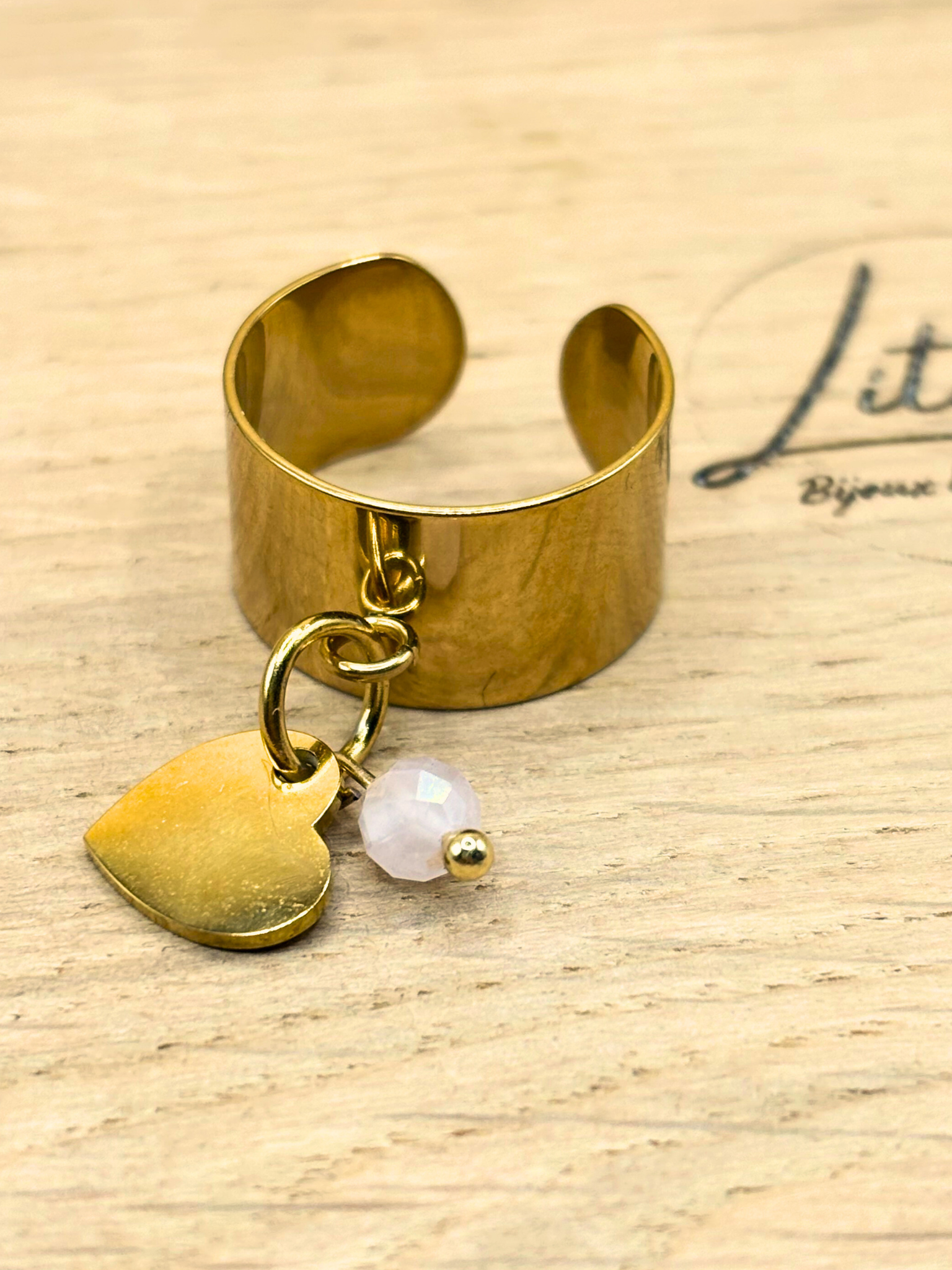 La bague Sia, en acier inoxydable doré 304, se distingue par son design raffiné : un petit cœur suspendu (10 mm) et une perle naturelle en quartz rose facettée (4 mm) qui ajoutent délicatesse et lumière.