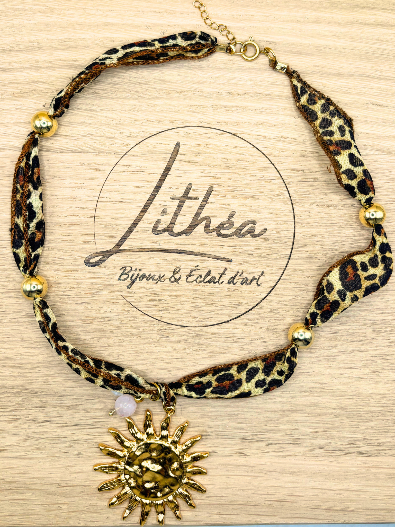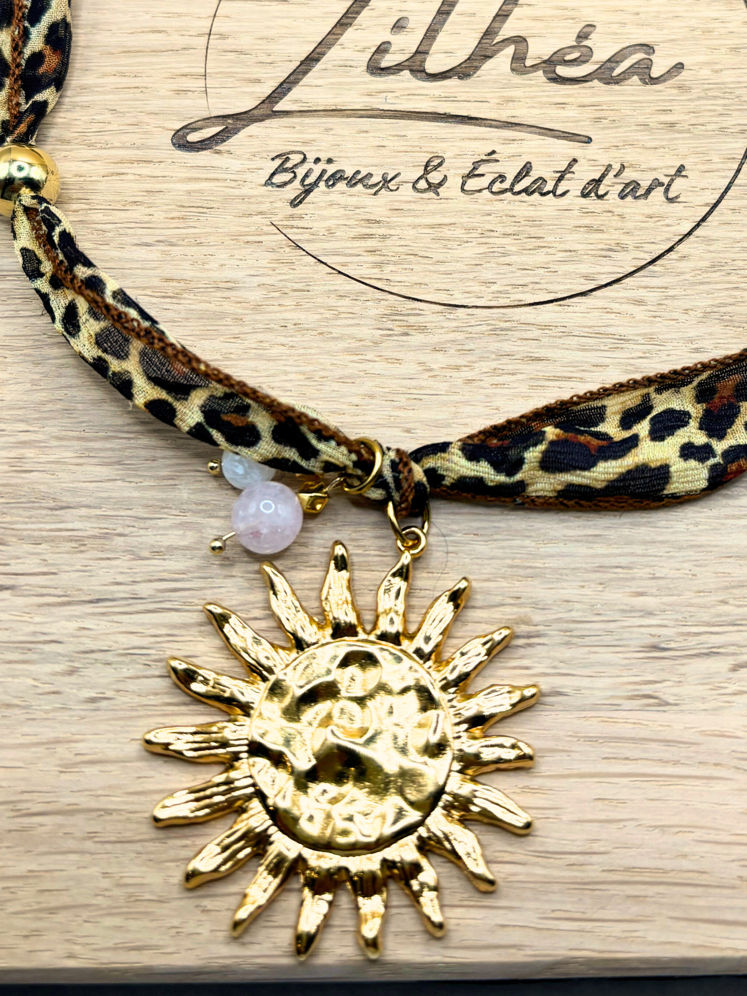 Monté sur un lien en tissu et sublimé par un fermoir rond doré, il allie douceur et élégance.